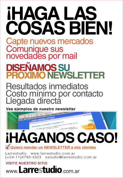 | Larrestudio www.larre.com.ar - [+54-11]4793-4323 - estudio@larre.com.ar © 2010 - Todos los derechos reservados. Este es un e-mail directo que consideramos de su interés, debido a que Ud. se ha contactado alguna vez con nuestra empresa, ha sido referido por alguien o nos ha enviado algún tipo de información, tanto Ud. como otros citando su nombre. De acuerdo con la ley argentina Nº 26.032, cuyo texto se encuentra en: http://infoleg.mecon.gov.ar/infolegInternet/anexos/105000-109999/107145/norma.htm, la libre distribución este e-mail está autorizada por tratarse de propósitos de información. Sin embargo, si le hemos causado alguna molestia por el mismo, le rogamos acepte nuestras disculpas. Para no recibir más información, haga click aquí. |